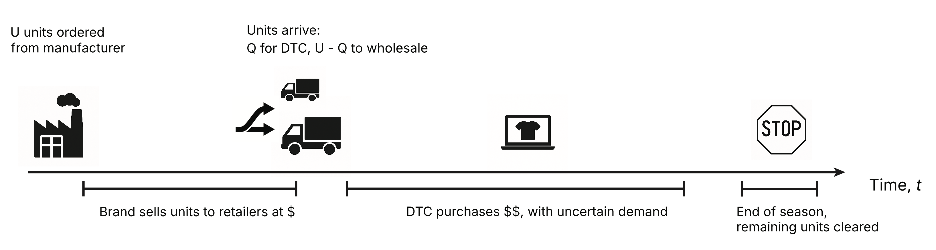 Each season, a brand develops its line and places production orders, locking in quantities. While production is underway, the line is sold to retailers at the wholesale price — typically one-third to one-half of the DTC price. This creates a familiar tradeoff: take the guaranteed wholesale sale now, or reserve units for potentially higher-margin DTC sales later, risking clearance costs if demand falls short. Figure 1 below summarizes the timeline of this process.