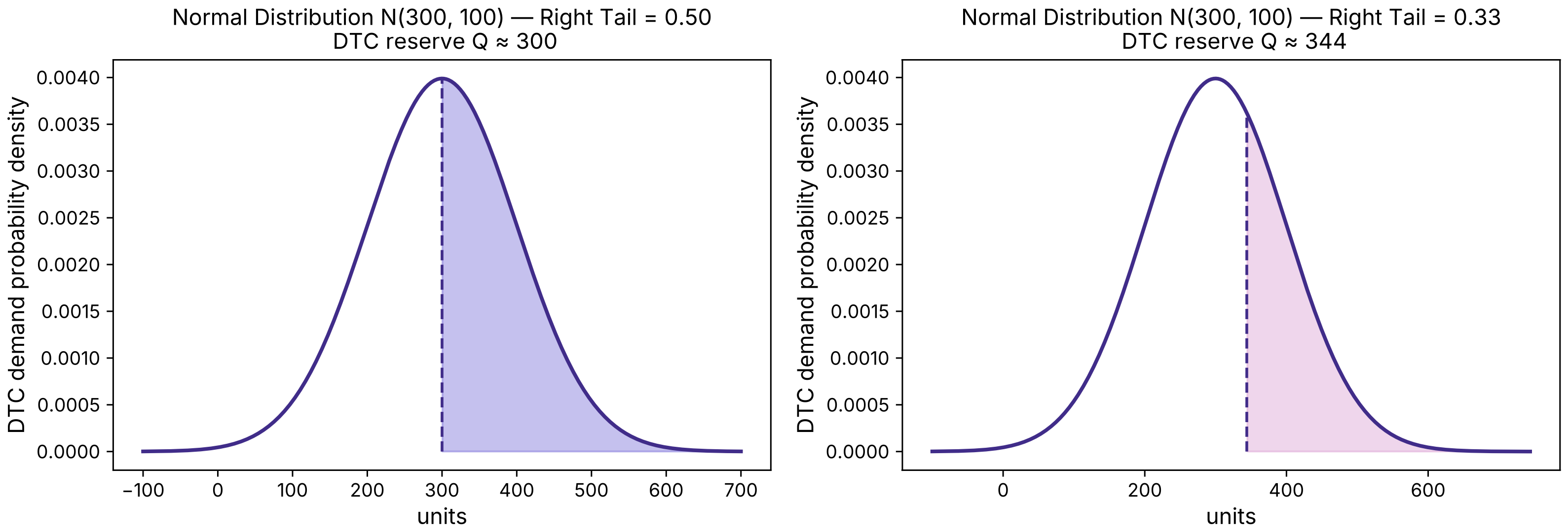 For a normal distribution, the point where stockouts occur half the time is the mean of the demand distribution — this is shown in the left panel of Figure 2 below. This means that in this case, we should reserve units for DTC.
